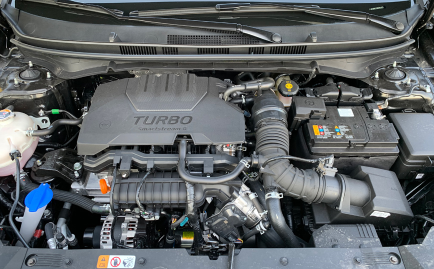 Κάτω από το μαύρο καπό (στολισμένο με τα μακρόστενα όμορφα φώτα ημέρας) του αυτοκίνητου της δοκιμής μας, «ζει» ο 1.0 T-GDI των 100 ίππων και 172 Nm, που –για την περίσταση- συνδυάζεται με χειροκίνητο κιβώτιο 6 σχέσεων. Η μέση κατανάλωση του συνδυασμού –σύμφωνα με τον κατασκευαστή- φτάνει στα 5,2 με 5,5 λτ./100 χλμ. (ανάλογα τον εξοπλισμό), τιμή που όμως δεν επιβεβαιώθηκε από τις δικές μας μετρήσεις. Κινούμενοι εντός και εκτός πόλης, συνήθως με την ρύθμιση κινητήρα στην επιλογή comfort (έχει και sport) το καλύτερο που καταφέραμε ήταν 7,2 λτ/100 χλμ, με το ελαφρυντικό πως το αυτοκίνητο της δοκιμής μας είχε ελάχιστα χιλιόμετρα λειτουργίας, ενώ η πολύ ζέστη και η φουλ λειτουργία του κλιματισμού επιβαρύνει την κατάσταση.