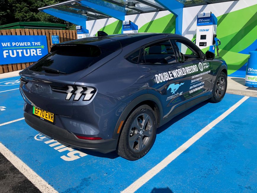 Η ταχεία φόρτιση με 150kW της πισωκίνητης Mustang Mach-E στην έκδοση extended range (που σημείωσε το ρεκόρ) προσθέτει περίπου 118χιλιόμετρα αυτονομίας με 10 λεπτά φόρτισης.