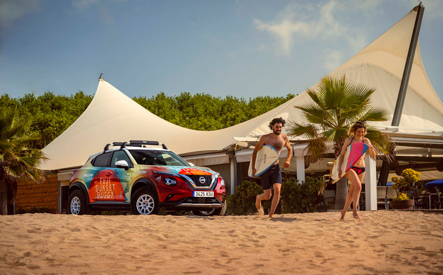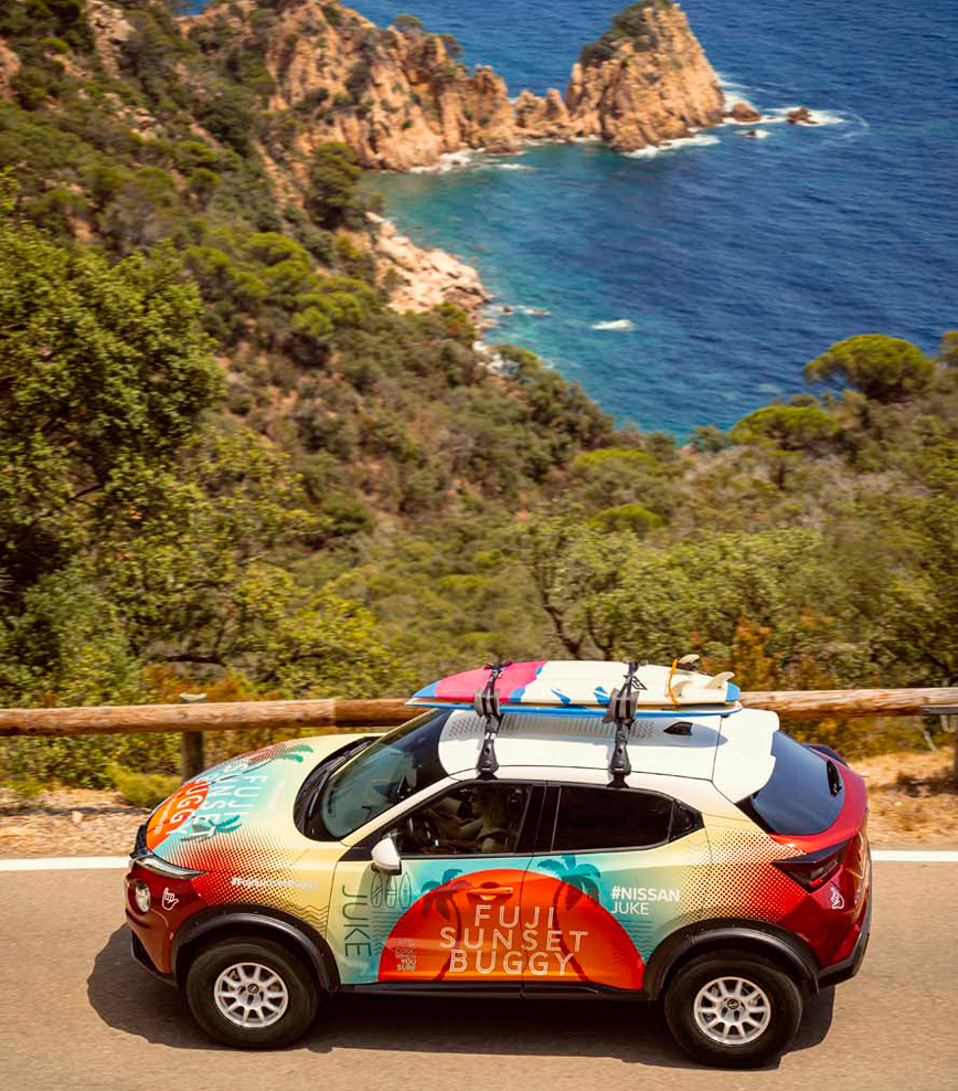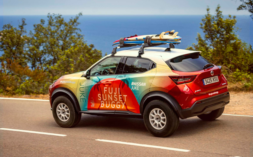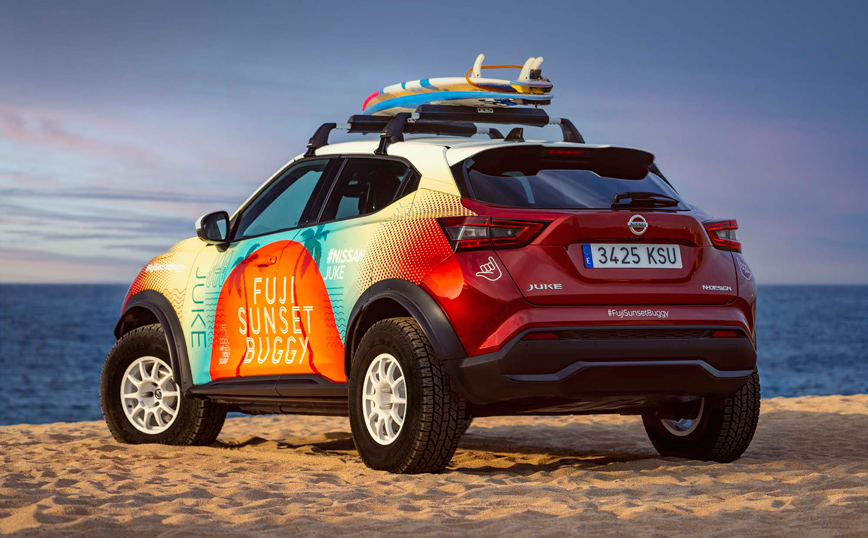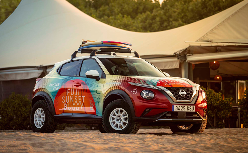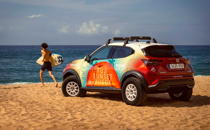 Η Nissan παρουσίασε πρόσφατα στην Ισπανία το πρωτότυπο Juke Fuji Sunset Buggy, που πήρε το όνομά του από το ομώνυμο εξωτερικό χρώμα της γκάμας του μοντέλου, συνδυάζοντας τους πορτοκαλί τόνους του ηλιοβασιλέματος πάνω από το όρος Fuji στην Ιαπωνία με τα ηλιοβασιλέματα στις ακτές της Μεσογείου. Το πρωτότυπο Juke, αποτελεί την πιο πρωτότυπη εκδοχή του δημοφιλούς compact crossover και έχει σχεδιαστεί για τους λάτρεις των θαλάσσιων σπορ, που εξερευνούν τις καλύτερες παραλίες με τις σανίδες του surf, στην οροφή του αυτοκινήτου τους.