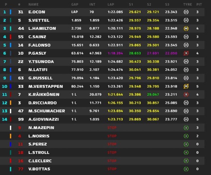 Αυτό, άλλωστε, φαίνεται και από την τελική κατάταξη, αφού νικητής αναδείχθηκε ο Οκόν με Alpine, με τον Φέτελ να τερματίζει 2ος και ο Χάμιλτον 3ος. Μια θέση που είναι καλή για τον Βρετανό όμως, αφού ο Φερστάπεν έμεινε στη 10η.