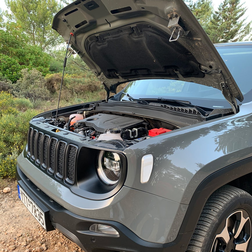 Η κινητήρια μονάδα του Renegade της δοκιμής μας έχει σαν βάση τον υπερτροφοδοτούμενο βενζινοκινητήρα 1.3 απόδοσης 180 ίππων με 270 Nm ροπής. Επιπλέον υπάρχουν δύο ηλεκτροκινητήρες (ένας στον εμπρός άξονα συνδεδεμένος με το βενζινοκινητήρα που λειτουργεί και σαν γεννήτρια, και ένα στον πίσω άξονα με ενσωματωμένο διαφορικό e-axle), που αποδίδει 60 ίππους και 250 Nm ροπής, ενώ ανακτά ενέργεια κατά την επιβράδυνση. Το σύστημα υποστηρίζεται και από μία μπαταρία ιόντων λιθίου 400 Volt, χωρητικότητας 11,4 kWh, τοποθετημένη κάτω από το πίσω κάθισμα.