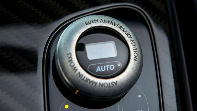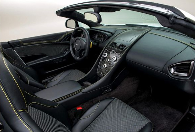 Το μοναδικό στιλ συνεχίζεται και στο εσωτερικό, όπου υπάρχουν δίχρωμα καθίσματα, κίτρινες ραφές και διάκοσμος από ανθρακονήματα. Στην καμπίνα υπάρχουν ειδικές πλακέτες, ενώ ο περιστροφικός διακόπτης φτιάχτηκε από μέταλλα που είχαν χρησιμοποιηθεί σε παλαιότερους κινητήρες της Aston Martin.