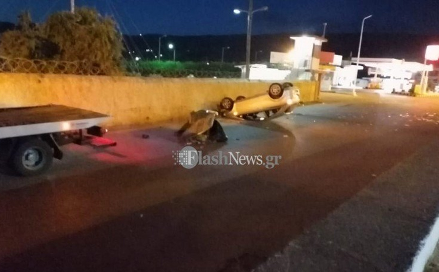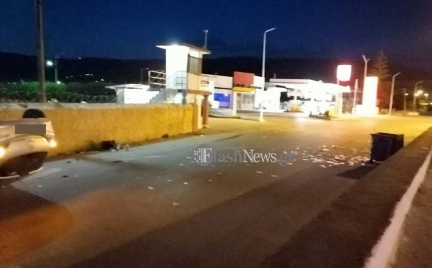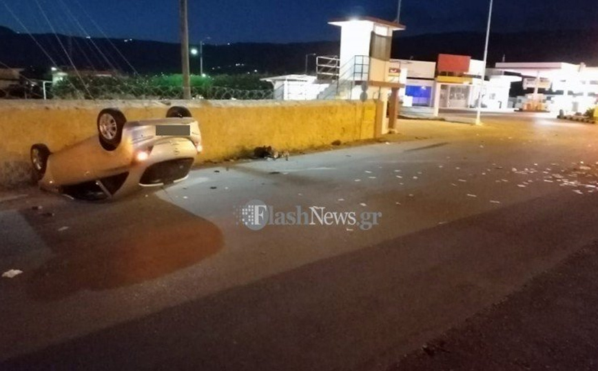 Tο αυτοκίνητο κατέληξε με τον ουρανό του στην άσφαλτο αφού πρώτα χτύπησε στο κράσπεδο του δρόμου. Η «προσγείωσή» του έγινε στον ακριβώς παράλληλο δρόμο που βρίσκεται στο ύψος του Ναυτικού Σταθμού Κρήτης στις Μουρνιές.