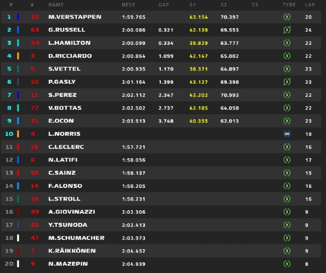 Ο διεκδικητής του τίτλου έκανε χρόνο 1:59:765 και αποδείχθηκε πως ήταν αρκετό για να εξασφαλίσει ότι στον αγώνα της Κυριακής θα ξεκινήσει από την 1η θέση. Και αν αυτό μπορεί να θεωρηθεί και είναι φυσιολογικό, το γεγονός ότι τον δεύτερο καλύτερο χρόνο, 2:00:086 για την ακρίβεια, τον έκανε ο Τζορτζ Ράσελ της Williams είναι έκπληξη.