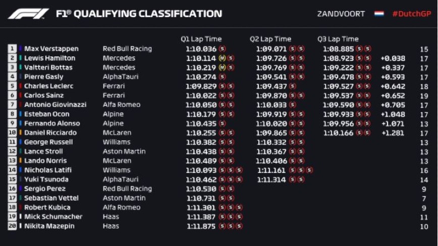 Ο Φερστάπεν, ο οποίος διεκδικεί… κανονικά και με το νόμο φέτος το πρωτάθλημα, έκανε 1:08.885 και αυτό αρκούσε για να ξεκινήσει από την 1η θέση την Κυριακή, αφού κανείς δεν κατάφερε να κάνει γρηγορότερο χρόνο. Ο Χάμιλτον ήταν οριακά πιο αργός με 1:08.923 και θα εκκινήσει από τη 2η θέση, ενώ στην 3η θα είναι ο Μπότας που έκανε 1:09.222.