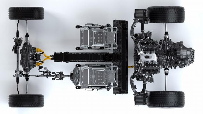 Μέσω τριών ηλεκτρικών μοτέρ, η κίνηση μεταδίδεται σε όλους τους τροχούς, σε αυτό που η εταιρεία αποκαλεί «Sport Hybrid Super Handling All-Wheel Drive». Δύο από τους ηλεκτροκινητήρες βρίσκονται μπροστά βοηθώντας στο κράτημα, με τον τρίτο να εδράζεται πίσω, ανάμεσα από το μοτέρ βενζίνης και το νέο 9άρι αυτόματο κιβώτιο διπλού συμπλέκτη. Το τελευταίο χρησιμεύει στην υποβοήθηση της επιτάχυνσης, του φρεναρίσματος και στις αλλαγές του κιβωτίου.