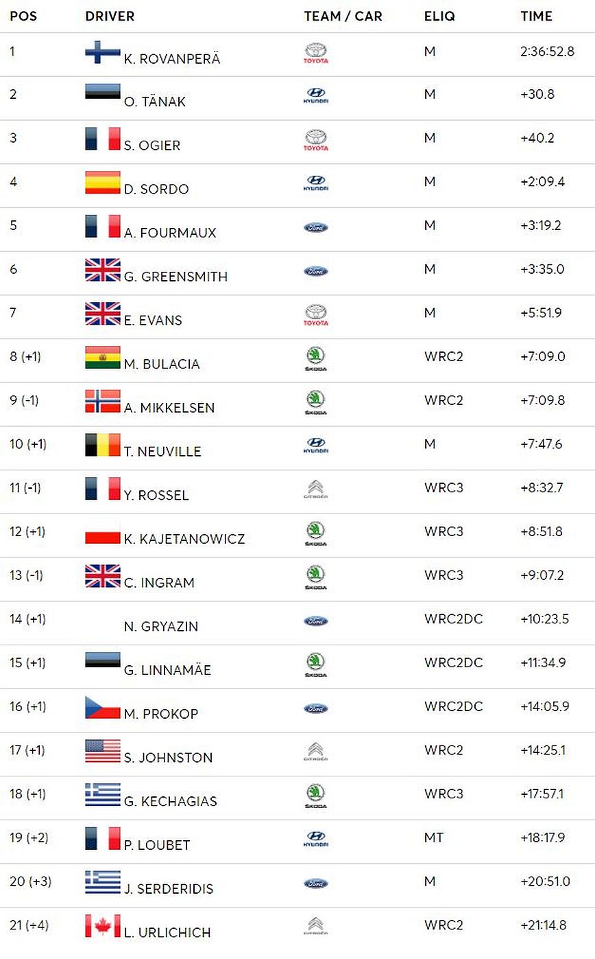 Ο 20χρονος Ροβάνπερα, που μέσα στη χρονιά έγινε ο νεότερος που οδηγεί την βαθμολογία και ο νεότερος νικητής στην ιστορία του WRC με την πρώτη θέση στην Εσθονία. Οι άλλες δύο ειδικές κατέληξαν στον Εσθονό Οτ Τάνακ και τον πρωτοπόρο στην κατάταξη Σεμπαστιάν Οζιέ με Toyota.