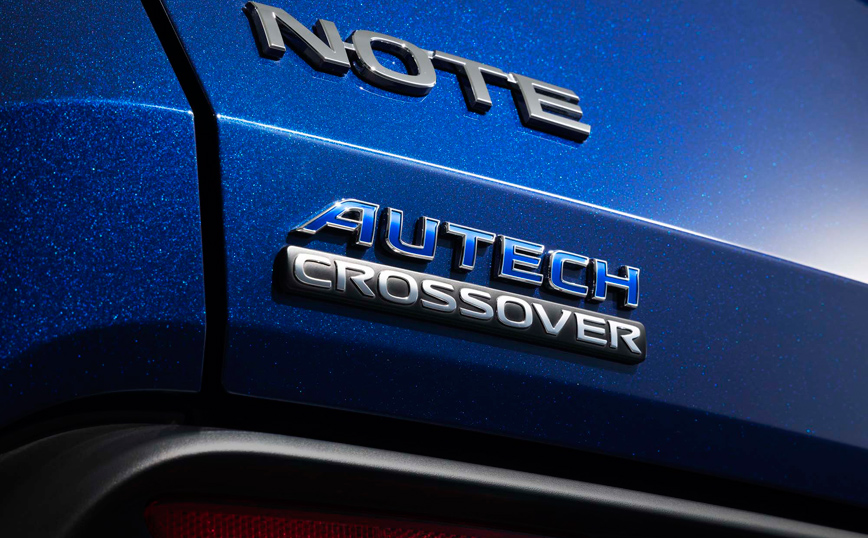 Το εξωτερικό διαθέτει μια μπροστινή μάσκα με το χαρακτηριστικό μοτίβο που συναντάται στα οχήματα της σειράς Autech, μπλε φώτα υπογραφής LED αποκλειστικά για το μοντέλο, καθώς και πλαϊνούς καθρέπτες με μεταλλικό φινίρισμα. Η ειδικά ρυθμισμένη ανάρτηση και τα ελαστικά μεγαλύτερης διαμέτρου, προσφέρουν στο Note Autech Crossover αυξημένη απόσταση από το έδαφος σε σύγκριση με το Note (25χλστ), καθιστώντας εύκολο τον χειρισμό σε ανώμαλο έδαφος και χιονισμένους δρόμους. Παράλληλα, τα ειδικά σχεδιασμένα πλευρικά προστατευτικά μαρσπιέ, οι διακοσμητικές επενδύσεις στους θόλους των τροχών, τα καλούπια της οροφής και οι ζάντες αλουμινίου, αποκλειστικής έκδοσης για το μοντέλο, προσθέτουν δυναμικό στυλ στο αυτοκίνητο.