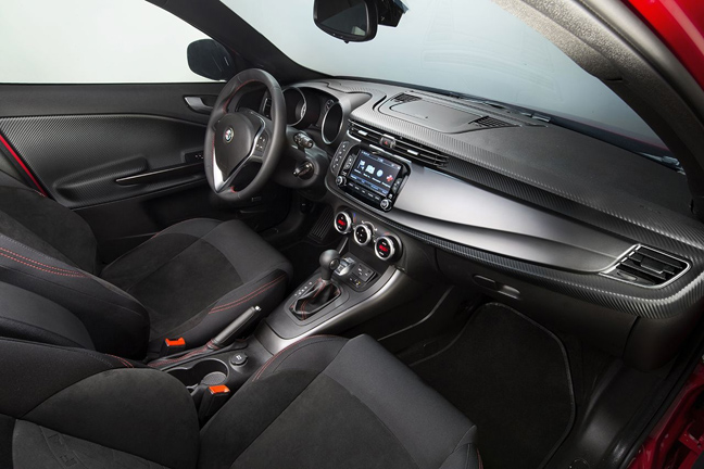 Εσωτερικά προσοχή έχει δοθεί σε όλες τις λεπτομέρειες και στα υψηλής ποιότητας υλικά, τα οποία επιλέχτηκαν για να αντιπροσωπεύουν την απόλυτη έκφραση του ιταλικού στιλ. Συγκεκριμένα, ξεχωρίζουν τα μαύρα σπορ τελειώματα, ενισχυμένα από το ύφασμα και τα καθίσματα Alcantara Sprint με κόκκινες ραφές και το λογότυπο στα προσκέφαλα. Ένα ακόμη στάνταρ χαρακτηριστικό είναι το δερμάτινο τιμόνι με κόκκινες ραφές, ενώ το ταμπλό και οι πόρτες έχουν ένα εκλεπτυσμένο τελείωμα σε χρώμα «carbon».