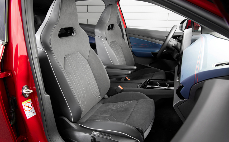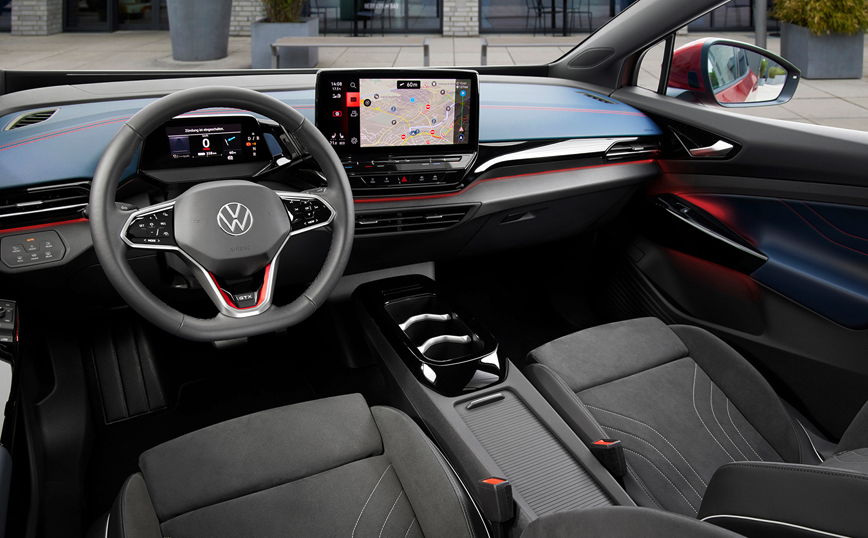 Ο βασικός εξοπλισμός στο ID.4 GTX περιλαμβάνει ατμοσφαιρικό φωτισμό με 30 χρώματα, θερμαινόμενο δερμάτινο τιμόνι και αναδιπλούμενα χωριστά υποβραχιόνια στα εμπρός καθίσματα. Τα καθίσματα συνδυάζουν ταπετσαρία υφάσματος (μη ζωικής προέλευσης) με κόκκινες ραφές και ένθετα δερματίνης στα γεμίσματα των μαξιλαριών βάσης και στο πάνω μέρος της πλάτης.