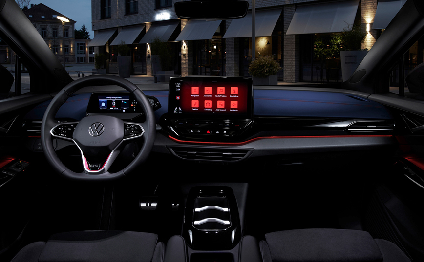 Το εσωτερικό του οχήματος παρουσιάζεται σε ένα νέο συνδυασμό χρωμάτων, με κυρίαρχο χρώμα το μαύρο. Το επάνω τμήμα του ταμπλό και τα ένθετα από δερματίνη στις πόρτες έρχονται σε X-Blue, μια σκούρα μπλε απόχρωση που αντιπροσωπεύει την αειφορία. Κόκκινες ραφές με αντίθεση – ένα κλασικό σύμβολο για σπορ χαρακτήρα και δύναμη – προσθέτουν χρώμα στα καθίσματα. Το τιμόνι, η κολόνα τιμονιού, το περίβλημα οθόνης και τα ένθετα πορτών είναι σε κομψό μαύρο. Το λογότυπο GTX εμφανίζεται στο τιμόνι, τα διακοσμητικά φύλλα των μαρσπιέ και (σε διάτρητη μορφή) στο πάνω μέρος των μπροστινών καθισμάτων. Τα πεντάλ από ανοξείδωτο ατσάλι διαθέτουν σχεδιασμό Play & Pause, σήμα κατατεθέν της οικογένειας ID..