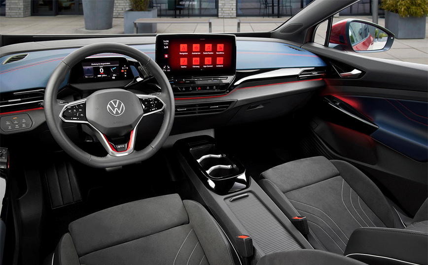 Το concept λειτουργίας στο ID.4 GTX είναι λιτό όσο και διαισθητικό. Ο χώρος του ταμπλό έχει σχεδιαστεί χωρίς φυσικά κουμπιά και διακόπτες. Με το πολυλειτουργικό τιμόνι, ο οδηγός μπορεί να ελέγξει μια συμπαγή οθόνη 5,3 ιντσών που δείχνει τις πιο σημαντικές πληροφορίες. Ένας μεγάλος διακόπτης στη δεξιά πλευρά χρησιμοποιείται για την επιλογή των προφίλ οδήγησης. Στο μέσο του ταμπλό φιλοξενείται η οθόνη αφής για το σύστημα πλοήγησης, τις λειτουργίες τηλεφώνου, τα πολυμέσα, τα συστήματα υποβοήθησης και τις ρυθμίσεις του οχήματος. Διαθέτει διαγώνια οθόνη 10 ιντσών ως στάνταρ, ενώ η έκδοση στο πακέτο Infotainment Plus έχει μέγεθος 12 ίντσες. Η στάνταρ φυσική λειτουργία φωνητικού ελέγχου “HelloID”, η οποία επεξεργάζεται μεγάλο αριθμό καθημερινών φράσεων, αποτελεί το δεύτερο επίπεδο λειτουργίας, ενώ χάρη στη σύνδεσή του στο Διαδίκτυο, μπορεί να αξιοποιήσει τις γνώσεις που συγκεντρώνονται στο Cloud.