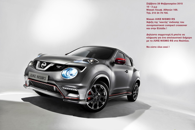 Το πρώτο Nissan Juke Nismo RS επί ελληνικού εδάφους, θα περιμένει το κοινό, το Σάββατο 28 Φεβρουαρίου, στην κεντρική έκθεση της Nissan, στη Λεωφόρο Αθηνών 169.