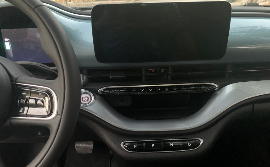 Από τα προφίλ λειτουργίας το «Normal» προσφέρει άμεση επιτάχυνση, ενώ με τα «Range» και «Sherpa» ενεργοποιείται η λειτουργία «one-pedal-drive», που επιτρέπει να οδηγείς με μόνο το πεντάλ του γκαζιού (όταν το αφήνεις λειτουργεί και σαν φρένο την ώρα που γίνεται ανάκτηση ενέργειας για την μπαταρία). Το αυτόματο κιβώτιο μονής σχέσης που δίνει κίνηση στους εμπρός τροχούς, ελέγχεται από πλήκτρα στο ταμπλό (Parking, Reverse, Drive, Neutral), εκεί που κάποτε υπήρχαν τα πλήκτρα για τα ηλεκτρικά παράθυρα, τα οποία τώρα είναι πάνω στις πόρτες, αλλά για ώρα ανάγκης υπάρχει χαμηλά μία παραδοσιακή χειρολαβή.