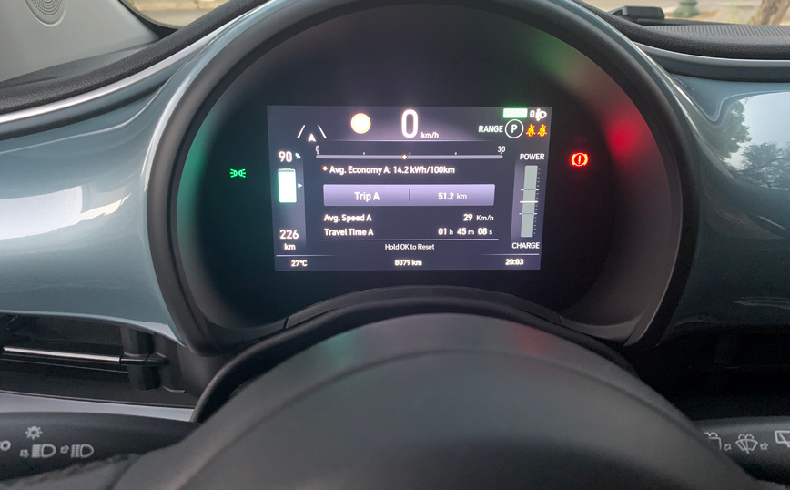 Στην πράξη με συντηρητικό ρυθμό και χωρίς πολλές περιφερειακές καταναλώσεις, καταφέραμε περίπου 230 χιλιόμετρα αυτονομίας, κινούμενοι εντός και στην περιφέρεια της πόλης, επίδοση όχι απογοητευτική, αλλά μακριά από τα υποσχόμενα του κατασκευαστή.