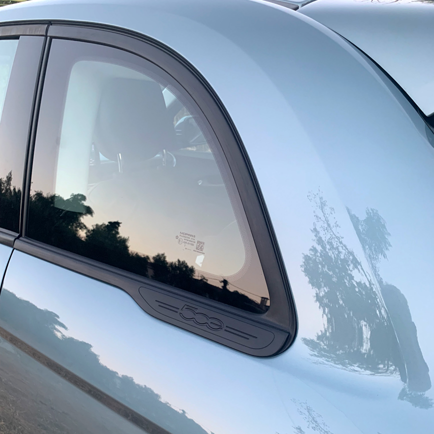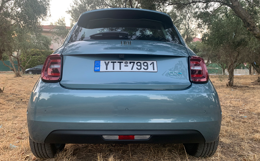 Το λογότυπο «500» στη μάσκα και τα φωτιστικά σώματα μαζί με τους κυψελωτούς αεραγωγούς του ηλεκτροκινητήρα που καταλαμβάνουν μεγάλο μέρος πάνω από τον εμπρός προφυλακτήρα, είναι η οπτική ταυτότητα του 500e. Στο προφίλ ξεχωρίζουν οι πανέμορφες 17άρες ζάντες αλουμινίου και το ανάγλυφο φλας ανάμεσα σε καπό και αμάξωμα, ενώ το logo 500 βρίσκεται σχεδόν παντού, με περισσότερες εμφανίσεις από το σήμα της μάρκας. Στην οικολογική κατεύθυνση και το χρώμα (Glacier Blue) που είχε το αυτοκίνητο της δοκιμής μας με την μεγάλη μπαταρία.
