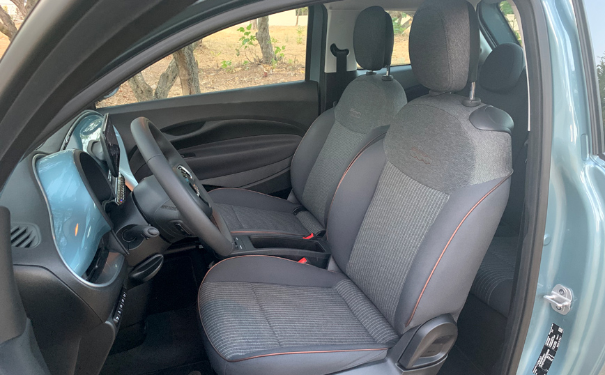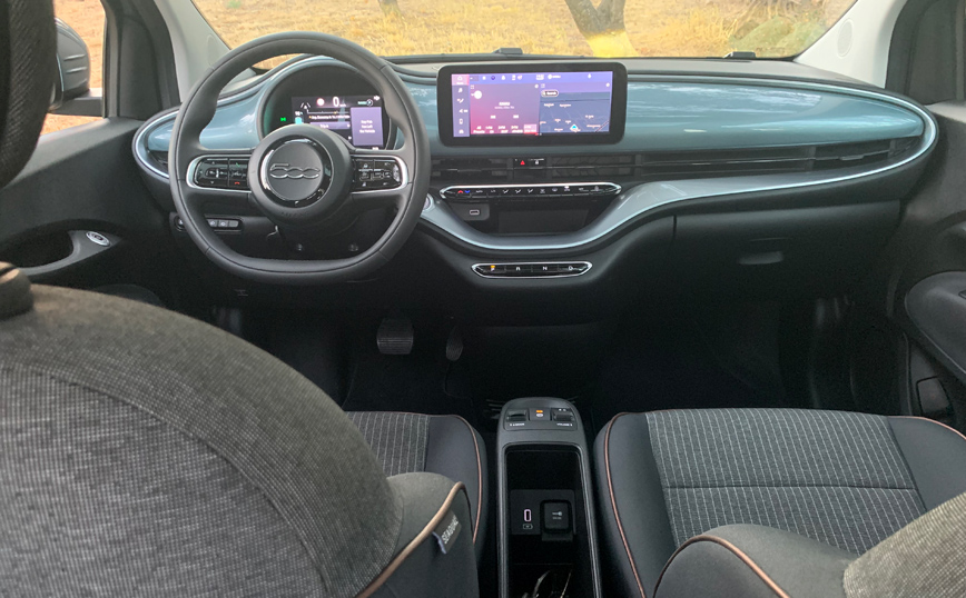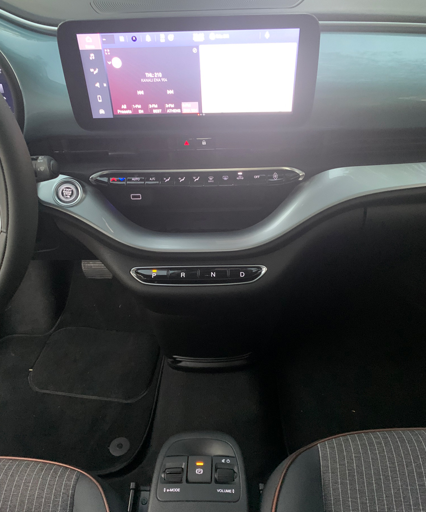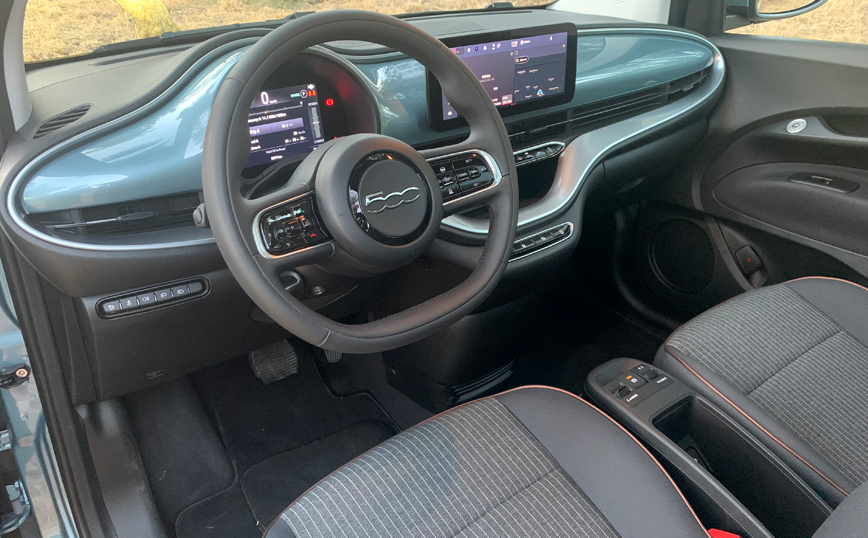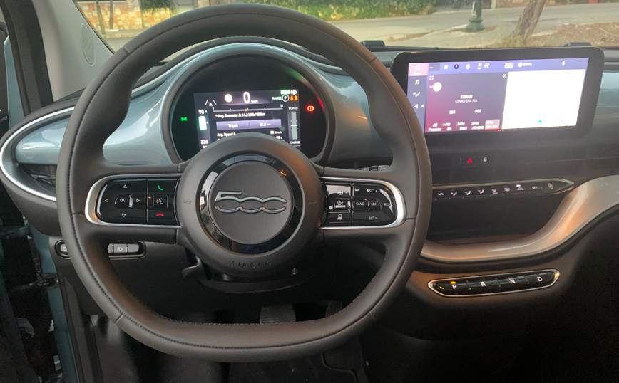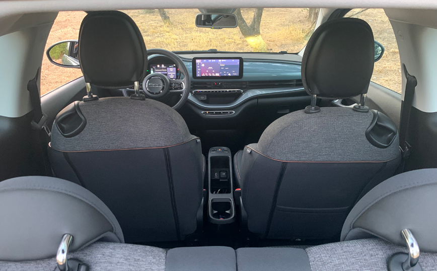 Ανοίγοντας την πόρτα διαπιστώνεις ότι, η προσεγμένη εξωτερική σχεδίαση συνεχίζεται και στο με ρετρό στυλ, αλλά λειτουργικά σύγχρονο εσωτερικό, που παραμένει από τα πλέον ευχάριστα της αγοράς με εμφανή ποιότητα κατασκευής. Ξεχωρίζει το πολυλειτουργικό τιμόνι και στρογγυλός ψηφιακός πίνακας οργάνων (απλός και ευανάγνωστος δίνει τις πληροφορίες που χρειάζεται ο οδηγός), ενώ στην έκδοση της δοκιμής μας (Icon) υπάρχει κεντρική οθόνη αφής 10,25 ιντσών (UConnect 5ης γενιάς), με δυνατότητα σύνδεσης σε Apple CarPlay ή Android Auto και συμβατότητα με δίκτυα 5G, ενώ υπάρχει και θέση για ασύρματη φόρτιση κινητού. Από την οθόνη αυτή (και από τον πίνακα οργάνων), ο οδηγός μπορεί να βλέπει κάθε στιγμή την αυτονομία, την στιγμιαία κατανάλωση σε kWh και τον τρόπο που ανακτά ή ξοδεύει ενέργεια το ηλεκτρικό σύστημα. Λεπτομέρεια η επένδυση του ταμπλό με χρώμα και όχι ταπετσαρία, όπως αυτή των άνετων καθισμάτων που προέρχεται από ανακυκλωμένα πλαστικά (μαζεύτηκαν από την θάλασσα!) και δίνει αίσθηση κατεργασμένου υφάσματος.