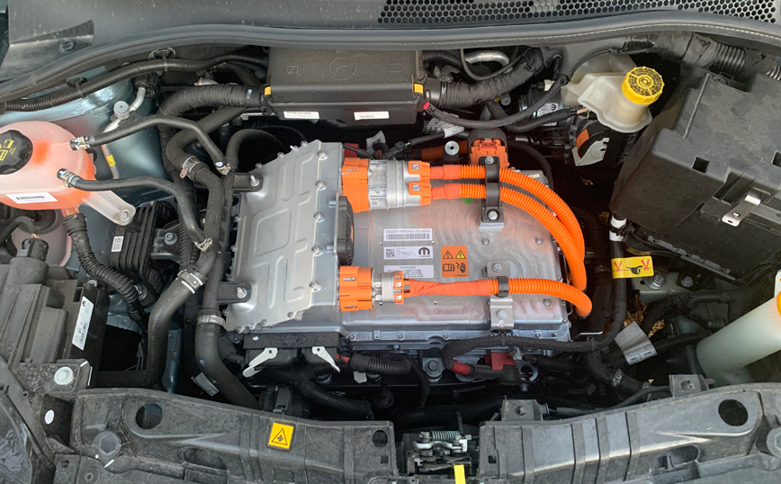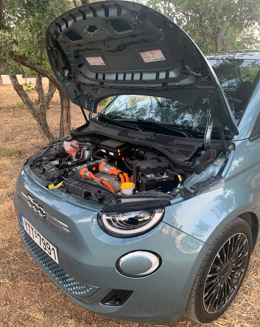 Η τοποθετημένη κάτω από τα καθίσματα μπαταρία ιόντων λιθίου 42 kWh (εγγύηση 8 χρόνια ή 160.000χλμ) που είχε η έκδοση Icon της δοκιμής μας, δίνει θεωρητική αυτονομία 320 χλμ. σε μεικτό κύκλο (κατά WLTP), που –θεωρητικά πάντα- αυξάνεται σε 460 χλμ όταν το 500e κινείται εντός πόλης.