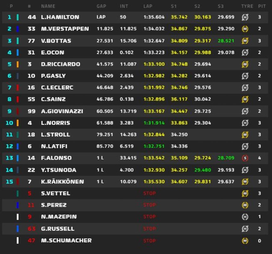 Στην… τρίτη εκκίνηση, πλέον, στην 1η θέση ήταν ο Οκόν και πίσω του ο Χάμιλτον, με τον Φερστάπεν να ξεκινάει ως τρίτος. Γεγονός που δεν τον επηρέασε, πάντως, αφού έφυγε καλύτερα από τους άλλους δύο και βρέθηκε να προπορεύεται ξανά. Οι δύο διεκδικητές του τίτλου έδιναν τη μάχη τους αλλά για ακόμη μία φορά οι συνθήκες του αγώνα άλλαξαν αφού είχαμε Εικονικό Αυτοκίνητο Ασφαλείας, διαδικασία που επαναλήφθηκε άλλες δύο φορές.