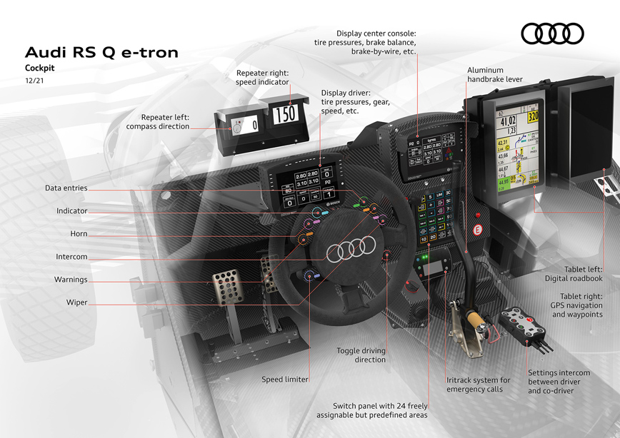 Η Audi αποκάλυψε λεπτομέρειες από το πιλοτήριο του RSQ e-tron, του αγωνιστικού πρωτότυπου με το οποίο θα συμμετάσχει στο Ράλι Ντακάρ, σε λιγότερο από μήνα. Κυριαρχούν οι οθόνες σε όλο το πλάτος του πίνακα οργάνων, θυμίζοντας πιλοτήριο αεροπλάνου. Στο παρελθόν, υπήρχε σαφής κατανομή των καθηκόντων στα ράλι cross-country: ο οδηγός οδηγεί, ο συνοδηγός πλοηγεί. Αυτοί οι ρόλοι έχουν αλλάξει εδώ και πολύ καιρό. Οι κανονισμοί πλέον περιορίζουν τις εργασίες πλοήγησης. Το πρώην χάρτινο roadbook, τώρα είναι ψηφιακό. Στο Audi RSQ e-tron, με μία νέα φιλοσοφία χειρισμού, οι ρόλοι οδηγού και συνοδηγού έχουν διαφοροποιηθεί από το παρελθόν.