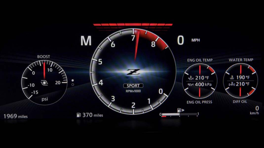 Στροφόμετρο: Το νέο Z διαθέτει ενδείξεις αλλαγής ταχυτήτων, όπως ακριβώς σε ένα αγωνιστικό αυτοκίνητο, οι οποίες ειδοποιούν τον οδηγό την ακριβή στιγμή για να ανεβάσει ταχύτητα. Ο μετρητής είναι τοποθετημένος με την κόκκινη γραμμή στραμμένη ευθεία προς τα πάνω (όπως στην ένδειξη δώδεκα η ώρα στο ρολόι), διευκολύνοντας την ορατότητα της βελόνας του στροφόμετρου όταν πλησιάζει σε αυτό το σημάδι. Αυτές οι προτάσεις έγιναν από τον επαγγελματία οδηγό αγώνων Tsugio Matsuda, έναν έμπειρο οδηγό αγώνων της Nissan στο GT500.