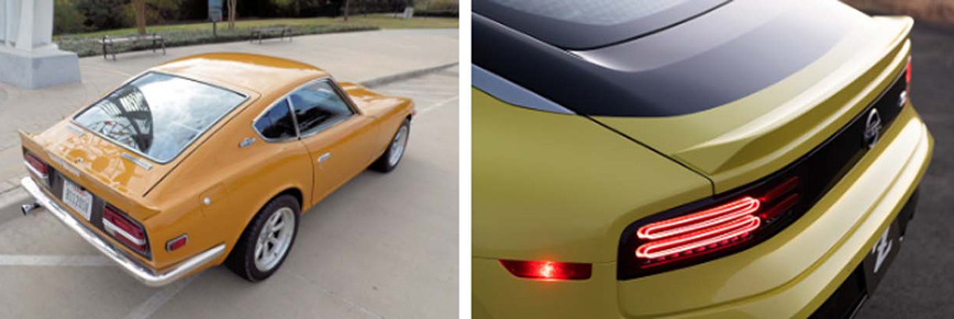 Πίσω φώτα: Το στυλ στην πίσω πλευρά του νέου Z είναι κατευθείαν εμπνευσμένο από το 300ZX (Z32). Το κεντρικό τμήμα που εκτείνεται σε όλο το πίσω μέρος είναι επίσης ένα σχεδιαστικό θέμα που συναντάται στο αρχικό Z και το 300ZX (Z31).