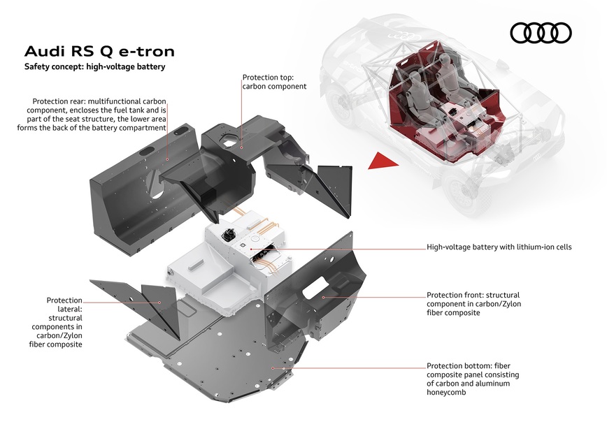 Η Audi συμμετέχει στο Ράλι Ντακάρ με στόχο να κάνει επίδειξη τεχνολογικής υπεροχής και στις αδυσώπητες συνθήκες της ερήμου. Το RSQ e-tron, το ηλεκτρικό πρωτότυπο που έχει εξελίξει η μάρκα ειδικά για τις αχανείς εκτάσεις της Σαουδικής Αραβίας, αποτελεί μία αγωνιστική ενσάρκωση του «Vorsprungdurch Technik» στην εποχή της ηλεκτροκίνησης, αλλά και στις πιο ακραίες κλιματολογικές συνθήκες. Στο κέντρο του καινοτόμου ηλεκτρικού κινητηρίου συστήματος (και χωροταξικά) βρίσκεται η μπαταρία, η οποία θα πρέπει να παρέχει ενέργεια αδιάλειπτα ενώ να είναι σε θέση να επαναφορτιστεί γρήγορα και αξιόπιστα.