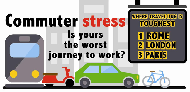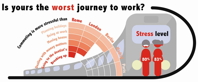 Η μετακίνηση τις ώρες αιχμής σε μερικές από τις μεγαλύτερες ευρωπαϊκές πόλεις αποτελεί τέτοια δοκιμασία ώστε οι εργαζόμενοι θεωρούν τη διαδρομή για τη δουλειά τους πιο στρεσογόνο παράγοντα από την ίδια τη δουλειά σύμφωνα με έρευνα.*