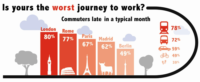 Οι ερωτηθέντες στη Ρώμη και το Λονδίνο ανέφεραν τις μεγαλύτερες δυσκολίες. Πάνω από τους μισούς περιέγραψαν με μελανά χρώματα τις καθημερινές διαδρομές στην Ιταλική πρωτεύουσα, ενώ το 8% των εργαζομένων στη Ρώμη ξεκινούν πάνω από μία ώρα νωρίτερα. Στο Λονδίνο, το 80% δήλωσε ότι αργοπορημένη άφιξη τουλάχιστον μία φορά το μήνα, με το 49% να μην έχει καταφέρει να φτάσει καν στη δουλειά σε μία περίπτωση τουλάχιστον κατά τη διάρκεια του τελευταίου χρόνου. Σε όλη την Ευρώπη, όσοι χρησιμοποιούν κυρίως λεωφορείο ή τρένο στις μετακινήσεις τους, είχαν τα μεγαλύτερα ποσοστά αργοπορίας και πλήρους αδυναμίας άφιξης στη δουλειά.