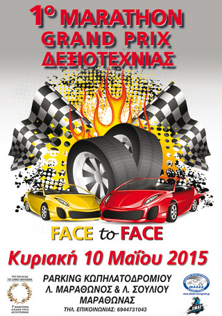 Η Ελληνική Λέσχη Αυτοκινήτου Δυτικής Αττικής, με την αιγίδα του δήμου Μαραθώνα, διοργανώνει στις 10 Μαΐου 2015 και ώρα 11.00 π.μ., το 1ο Grand Prix Δεξιοτεχνίας Face to Face, στο parking του κωπηλατοδρομίου του δήμου Μαραθώνα, στη διασταύρωση των Λεωφόρων Μαραθώνα και Σουλίου.