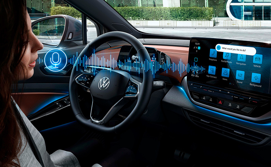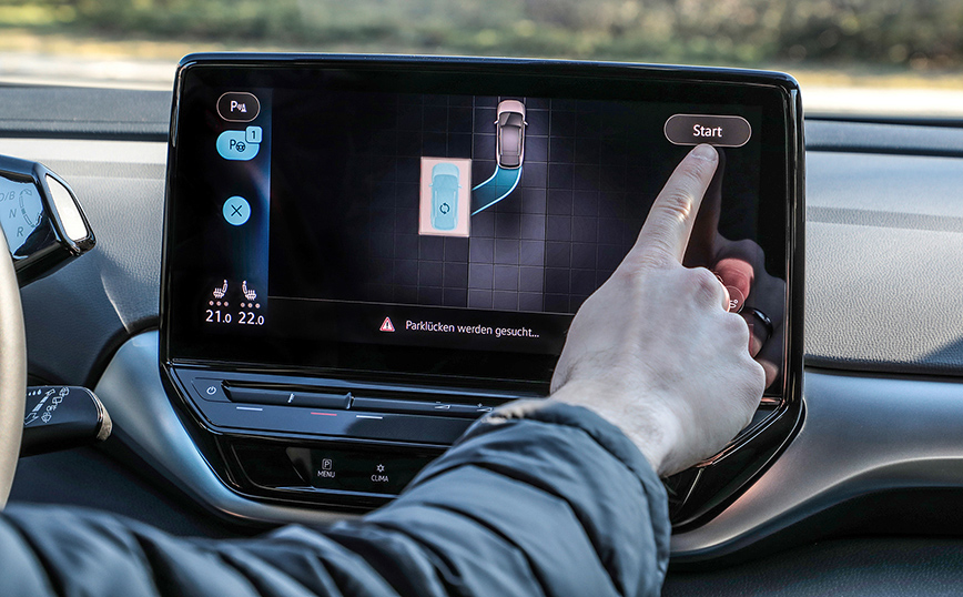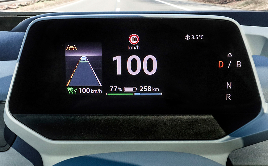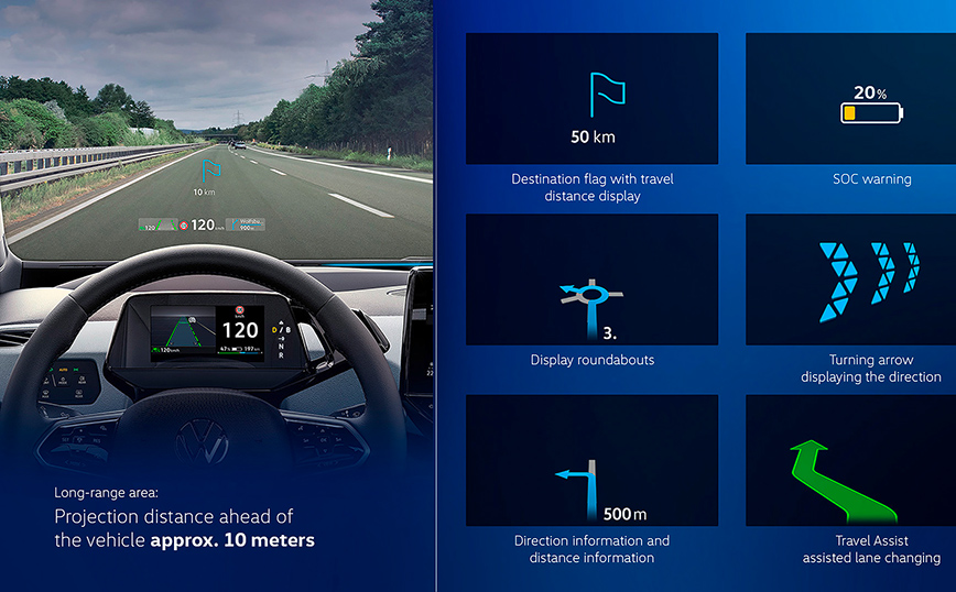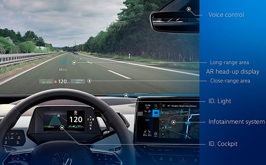 – Αναβαθμίζεται η head-up οθόνη επαυξημένης πραγματικότητας, η οποία προβάλλει επιπλέον πληροφορίες στο οπτικό πεδίο του οδηγού στο παρμπρίζ καθώς και νέα σύμβολα όπως κυκλικούς κόμβους και πληροφορίες για την απόσταση από τον προορισμό, με τα βέλη στροφής να φαίνονται πλέον πολύ πιο ενσωματωμένα στο περιβάλλον. Στο ID. Cockpit, εκτός της υπολειπόμενης αυτονομίας, εμφανίζεται και η κατάσταση φόρτισης (SOC) ως ποσοστό επί τοις εκατό, ικανοποιώντας σχετική επιθυμία μεγάλου αριθμού πελατών.