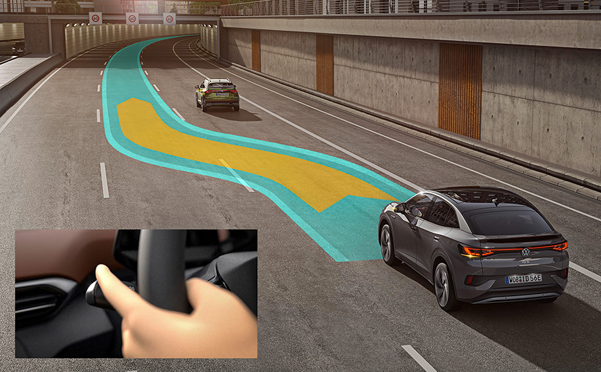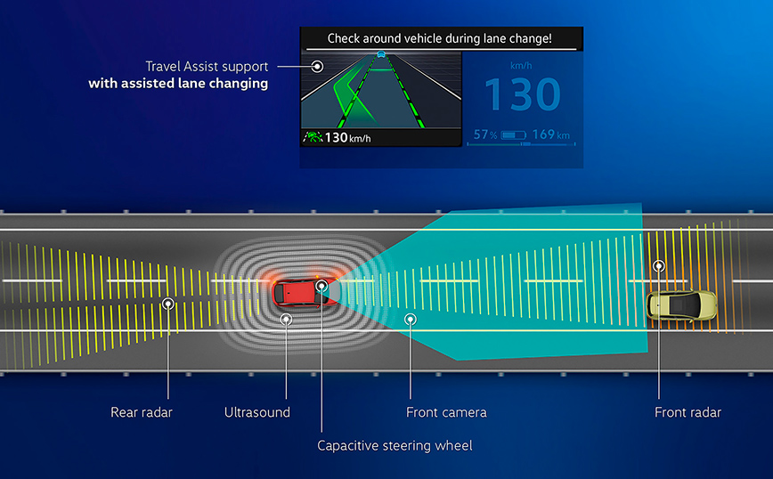 – Το σύστημα «Travel Assist» εμπλουτίζεται με τη λειτουργία υποβοήθησης αλλαγής λωρίδας στον αυτοκινητόδρομο. Αυτό υλοποιείται με τη χρήση υπερήχων και δύο ραντάρ στο πίσω μέρος του αυτοκινήτου, σε ταχύτητες 90 χλμ./ώρα και άνω, με προϋπόθεση οι αισθητήρες να μην έχουν εντοπίσει αντικείμενα στη γύρω περιοχή και ο οδηγός να έχει τα χέρια του στο ευαίσθητο στην αφή τιμόνι. Με τη χρήση σμήνους δεδομένων από άλλα οχήματα, το σύστημα μπορεί επίσης να παρέχει υποστήριξη σε δρόμους με ελλιπή σήμανση λωρίδας, για παράδειγμα επαρχιακούς.
