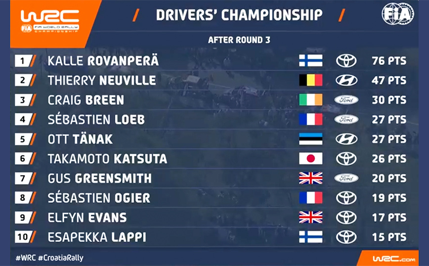 Ο νεαρός οδηγός της Toyota (με συνοδηγό τον συμπατριώτη του Χάλτουνεν), οδήγησε το Yaris Rally1 στην 4η νίκη της καριέρας του και έβαλε ήδη σοβαρή υποψηφιότητα για το πρώτο του πρωτάθλημα, καθώς ήδη προηγείται με 29 βαθμούς από τον 2ο. Αν τελικά αυτό συμβεί, τότε τα 8 πρωταθλήματα του Οζιέ και τα 9 του Λεμπ, δεν θα …αισθάνονται καθόλου καλά, αφού ο Κάλε έχει μπροστά του όλο τον χρόνο να τα φτάσει και να τα ξεπεράσει.
