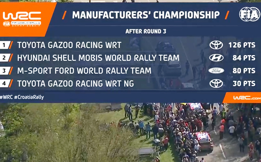 Η διαφορά στο πρωτάθλημα κατασκευαστών είναι ακόμα μεγαλύτερη υπέρ της Toyota που προηγείται με 126 β., με 2η την Hyundai (84 β.) και 3η την Ford (79 β.).