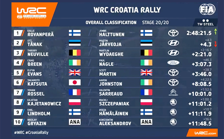 Όμως, στην τελευταία ειδική του αγώνα, αυτή που δίνει και τους επιπλέον βαθμούς, ο νεαρός Φιλανδός απέδειξε ότι δεν «μασάει» από πίεση ανακτώντας άνετα την διαφορά, γεγονός που τον ανέβασε στο πιο ψηλό σκαλί του πόντιουμ, την ώρα που ο Τάνακ έμεινε 2ος, αλλά με την ικανοποίηση ότι το Hyundai επιστρέφει σε πρωταγωνιστικό ρόλο. Την υπόθεση αυτή ενισχύει και η 3η θέση που κατέλαβε ο άλλος οδηγός της Κορεάτικης ομάδας, ο Βέλγος Τιερί Νεβίλ (συνοδηγός ο Βέλγος Γουϊτανκε) που κέρδισε και τρεις από τις 19 ειδικές του αγώνα.