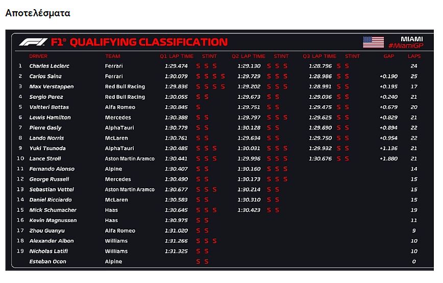 Ο Σαρλ Λεκλέρ έκανε το χατ τρικ στις pole position φέτος και στο GP Μαϊάμι θα ξεκινήσει για 3η φορά από την πρώτη θέση. Δίπλα του θα έχει τον Κάρλος Σάινθ, που συμπλήρωσε το 1-2 για τη Ferrari. Ο Μαξ Φερστάπεν ήταν πολύ γρήγορος και ύστερα από ένα μικρό λάθος στον τελευταίο γύρο του έμεινε στην 3η θέση. Και αυτός θα έχει δίπλα του τον ομόσταβλό του, καθώς ο Σέρχιο Πέρεζ με την άλλη Red Bull Racing πήρε την 4η θέση.