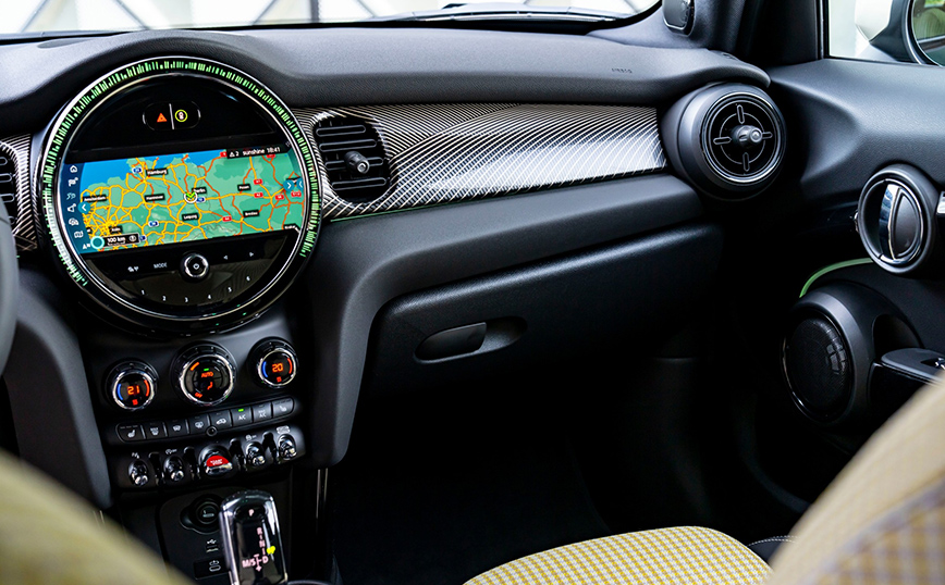 Παράλληλες και ομοιόμορφες καμπύλες γραμμές σε ανοιχτή χρυσαφί απόχρωση, σχηματίζουν ένα ριγέ μοτίβο στο μαύρο φόντο των επιφανειών του εσωτερικού της ειδικής έκδοσης, παραπέμποντας την ίδια στιγμή στις ρίγες του καπό. Τα αποκλειστικά σχεδιαστικά στοιχεία αναδεικνύονται με τη βοήθεια του πακέτου φωτισμού, του οποίου οι μονάδες LED παρέχουν στοχευμένο φωτισμό εσωτερικού. Η λειτουργία κρυφού φωτισμού Ambient Light (περιλαμβάνεται στον εξοπλισμό της ειδικής έκδοσης) προάγει την κομψότητα με χαρακτηριστικά όπως ένα πλαίσιο χαραγμένο με λέιζερ για το κεντρικό όργανο, φωτεινές λωρίδες στις πόρτες και στην περιοχή του cockpit, καθώς και στις χειρολαβές των θυρών και στις περιοχές εισόδου. Επιπλέον, το 5θυρο Cooper σε Resolute Edition, περιλαμβάνει τα Mini Driving Modes, με τα οποία ο οδηγός ενεργοποιεί τα σπορ χαρακτηριστικά των συστημάτων μετάδοσης κίνησης και ανάρτησης μέσω ενός διθέσιου διακόπτη (toggle switch).
