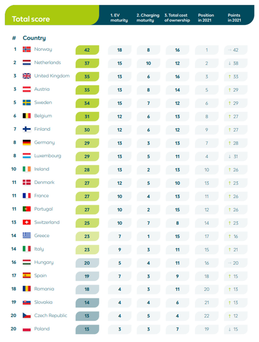 Στην κορυφή της κατάταξης παρέμειναν και τη φετινή χρονιά η Νορβηγία, η Ολλανδία και το Ηνωμένο Βασίλειο, εξακολουθώντας να είναι οι καλύτερα προετοιμασμένες χώρες για τη μετάβαση στα EVs, ενώ Τσεχία και Πολωνία αποδείχθηκαν οι λιγότερο EV-readyχώρες για το 2022.