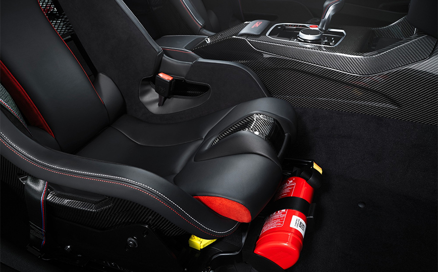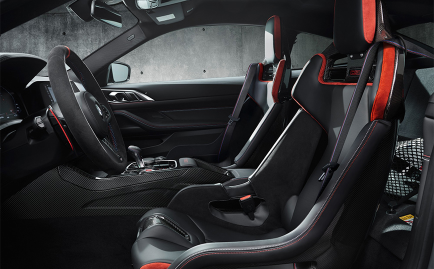 Τα ειδικά για το μοντέλο στοιχεία εξοπλισμού προσφέρουν στην M4 CSL συνδυασμό καθημερινής χρηστικότητας με καθαρόαιμου σπορ οχήματος. Τα full bucket καθίσματα M Carbon για τον οδηγό και το συνοδηγό χαρακτηρίζονται από μία αυτοφερόμενη δομή από CFRP και είναι σκόπιμα απαλλαγμένα από στοιχεία που βελτιώνουν την άνεση. Έχουν σταθερή γωνία όσον αφορά την κλίση της πλάτης, οι ρυθμίσεις εμπρός/πίσω μπορούν να γίνονται χειροκίνητα, ενώ το ύψος του καθίσματος μπορεί να ρυθμίζεται μόνο σε συνεργείο χρησιμοποιώντας ένα βιδωτό σύνδεσμο τριών σταδίων. Τα full bucket καθίσματα M Carbon έχουν επίσης αποσπώμενα προσκέφαλα και επιτρέπουν την ενσωμάτωση ενός συστήματος ζώνης ασφαλείας έξι σημείων.