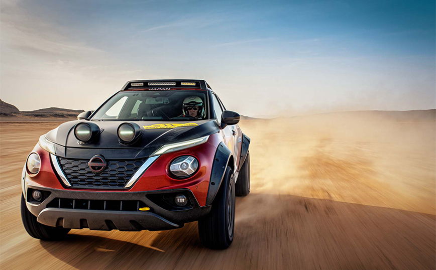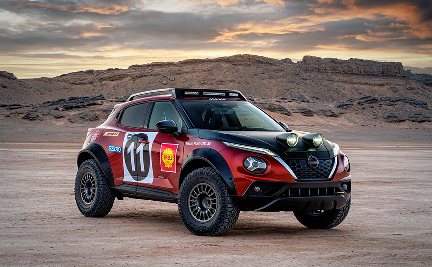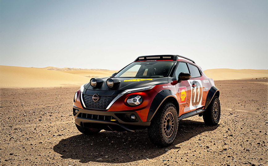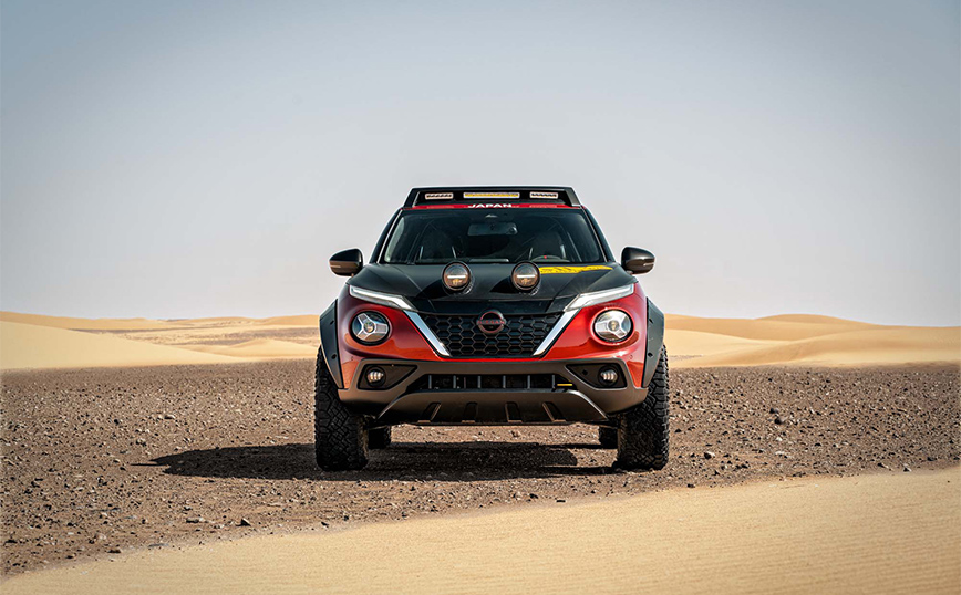 Το Juke Hybrid Rally Tribute παίρνει τα σχεδιαστικά του στοιχεία από το εμβληματικό 240Z, που αγωνίστηκε με επιτυχία στα ράλι της ερήμου, πριν από μισό αιώνα. Η πιο εμφανής τροποποίηση είναι οι διευρυμένοι θόλοι των τροχών, προκειμένου να χωρέσουν τα ειδικής κατασκευής off-road ελαστικά, ενώ τα πρόσθετα φώτα τοποθετημένα στο καπό και στην οροφή υπογραμμίζουν τον χαρακτήρα του οχήματος ως ανταγωνιστικού off-roader.
