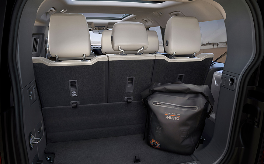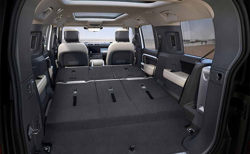Η πρόσβαση στον χώρο αποσκευών (χωρητικότητα 3.893 λίτρα) παραμένει αμετάβλητη, ενώ διατίθεται ένα σκληρό κάλυμμα στο χρώμα του αμαξώματος για τη ρεζέρβα. Οι ράγες οροφής σε Narvik Black τοποθετούνται στάνταρ, ενώ διατίθεται η πλήρης γκάμα αξεσουάρ εξωτερικού συμπεριλαμβανομένων των πακέτων Explorer, Adventure, Country και Urban. Όταν τα καθίσματα (διαιρούμενα σε διάταξη 40:20:40) δεν χρησιμοποιούνται, αποθηκεύονται για τη δημιουργία μιας μεγάλης επιφάνειας φόρτωσης, ώστε οι πελάτες να έχουν τις καλύτερες επιλογές για τη διαμόρφωση της διάταξης του εσωτερικού που ταιριάζει άριστα στις ανάγκες τους. Για οικογένειες, βάσεις παιδικών καθισμάτων ISOFIX υπάρχουν σε έως και πέντε καθίσματα επιβατών – στα εξωτερικά της δεύτερης και τρίτης σειράς καθώς και στο κάθισμα του συνοδηγού. Τέλος, η 5θέσια έκδοση του Defender 130 προσφέρει έναν τεράστιο χώρο φόρτωσης έως και 2.5161 λίτρων με τη δεύτερη σειρά αναδιπλωμένη.