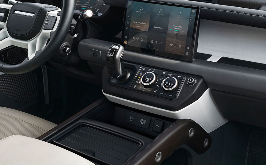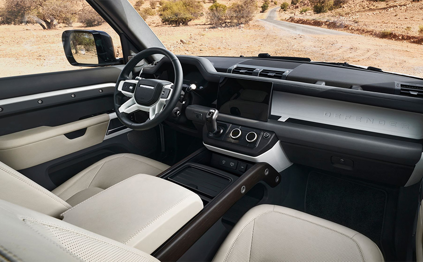 Το νέο Defender 130 εφοδιάζεται στάνταρ με μεγαλύτερη οθόνη αφής 11.4” Pivi Pro, ενώ οι επιβάτες αναπνέουν πιο καθαρό αέρα με το προηγμένο σύστημα Cabin Air Purification Plus που ανήκει στον στάνταρ εξοπλισμό. Το εσωτερικό είναι ντυμένο με δέρμα Light Oyster και ξύλο Natural Light Oak, με Cross Car Beam και εκτεταμένες λεπτομέρειες χρωμίου.