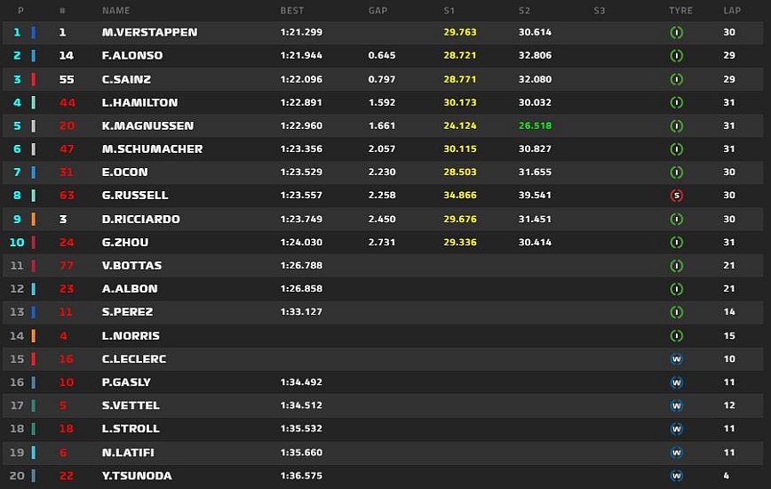 Πολύ καλή εμφάνιση για το δίδυμο της Haas, με τον Κέβιν Μάγκνουσεν στην 5η θέση και τον Μικ Σουμάχερ στην 6η. Ακολούθησαν οι Οκόν, Ράσελ, Ρικάρντο και Ζου.