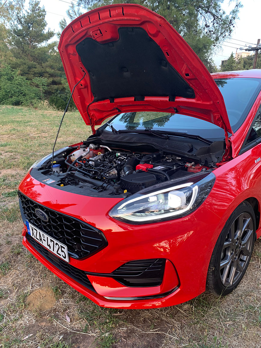 Το νέο Fiesta είναι υβριδικό προς όφελος της απόδοσης και της μείωσης κατανάλωσης – ρύπων. Στην περίπτωση της δοκιμής μας ο γνωστός 1.000άρης EcoBoost κινητήρας βενζίνης υποστηρίζεται από ένα ήπιο υβριδική σύστημα με μπαταρία 48-volt. Το σύστημα που ενισχύει τον σπορ χαρακτήρα του μοντέλου, έχει μία ενσωματωμένη μίζα/γεννήτρια (BISG) που παίρνει κίνηση μέσω ιμάντα. Αυτό επιτρέπει την ανάκτηση και αποθήκευση της ενέργειας που συνήθως χάνεται στο φρενάρισμα και το ρολάρισμα σε μία αερόψυκτη μπαταρία ιόντων λιθίου των 48 Volt. Το σύστημα BISG λειτουργεί και σαν ηλεκτροκινητήρας (16 ίπποι, 50 Nm ροπή) συνεχούς υποβοήθησης του κινητήρα, χρησιμοποιώντας την αποθηκευμένη ενέργεια για την παροχή επιπλέον ροπής, αλλά και για τη λειτουργία των περιφερειακών ηλεκτρικών συστημάτων. Επίσης, συνδράμει το σύστημα stop/start επανεκκινώντας τον κινητήρα σε 350 χιλιοστά του δευτερολέπτου, με αποτέλεσμα το αυτόματο σύστημα να απενεργοποιεί τον κινητήρα όχι μόνο στη στάση, αλλά και στο ρολάρισμα με ταχύτητα κάτω των 25 χλμ./ώρα ακόμα και με σχέση στο κιβώτιο.