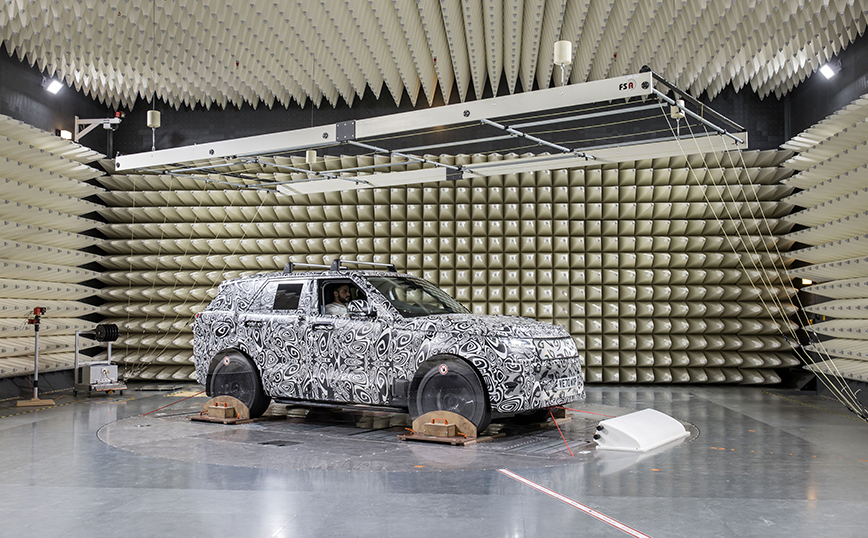 Το νέο εργαστήριο οχημάτων της Jaguar Land Rover διαθέτει δύο ανηχοϊκούς θαλάμους: έναν ηλεκτρικά ‘αθόρυβο’ κυλιόμενο δρόμο που επιτρέπει στους μηχανικούς να δοκιμάζουν τα οχήματα με ταχύτητα, καθώς και εξοπλισμό για την αξιολόγηση της απόδοσης μεμονωμένων εξαρτημάτων, όπως οι μπαταρίες ή οι ηλεκτροκινητήρες. Bluetooth, GPS, WiFi, 4G, 5G, adaptive cruise control, ασύρματη φόρτιση και παρακολούθηση τυφλού σημείου (blind spot monitoring) είναι όλα παραδείγματα υπηρεσιών οχημάτων και λειτουργιών που θα δοκιμαστούν για ηλεκτρομαγνητική συμβατότητα (EMC).