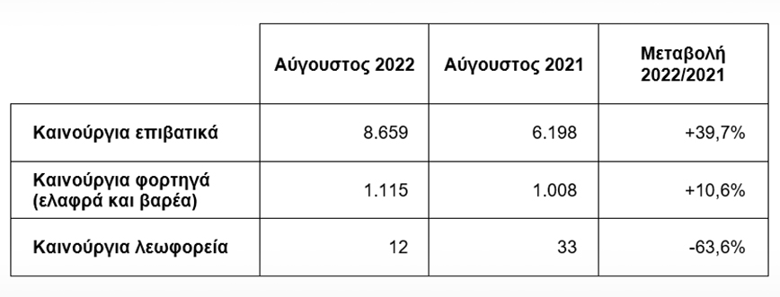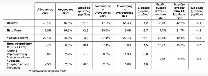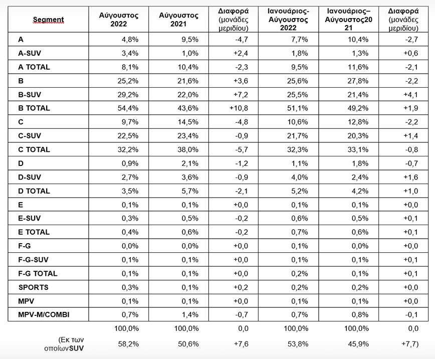 Σύμφωνα με πρώτους υπολογισμούς, η πρόοδος στα segments επιβατικών και στην κατανομή ανά καύσιμο, ως και τον Αύγουστο, έχει ως εξής: