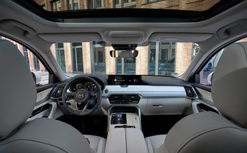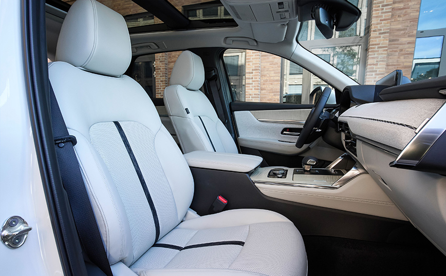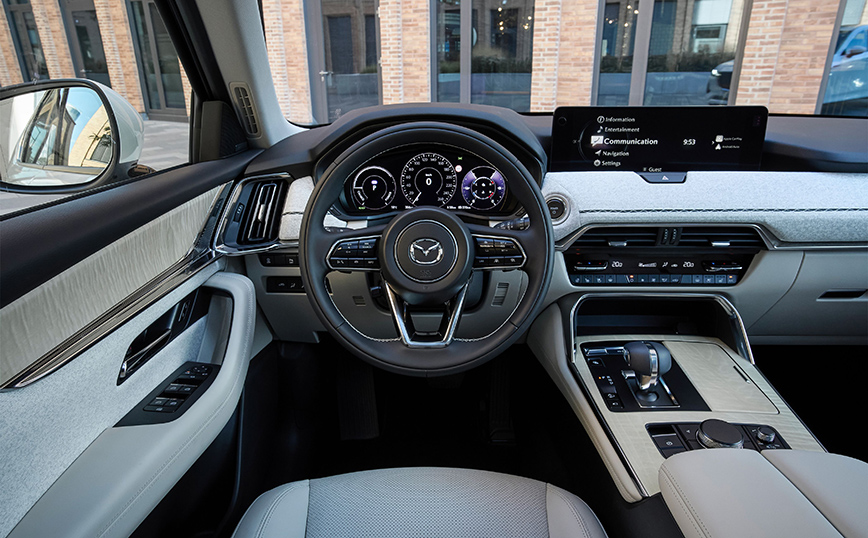 Η κομψή και ποιοτική εσωτερική σχεδίαση συνδυάζει διαφορετικά υλικά και υφές, όπως ξύλο σφένδαμου, δέρμα nappa, μοναδικής κατεργασίας ιαπωνικά υφάσματα, λεπτομέρειες χρωμίου και εμφανείς ραφές στον πίνακα οργάνων.