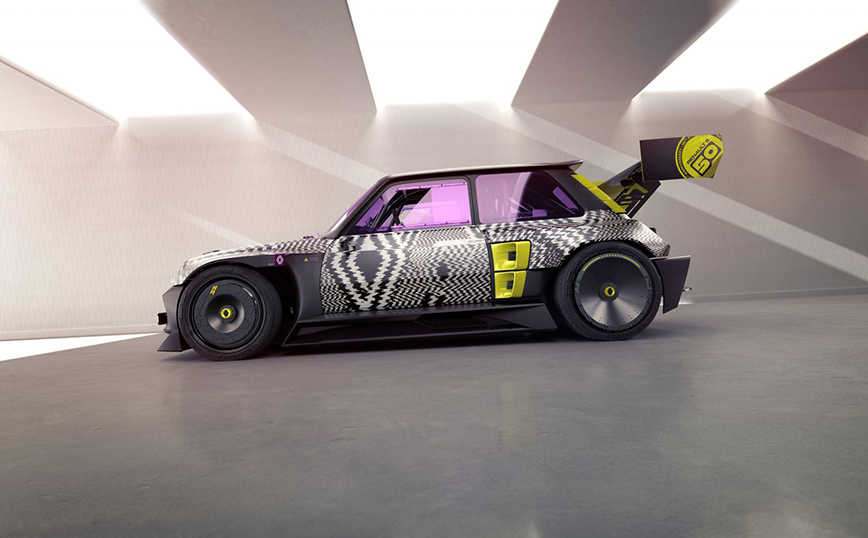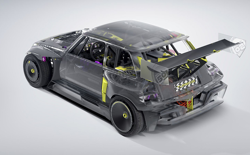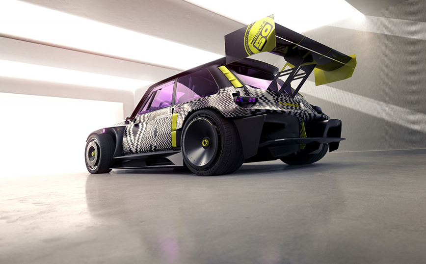 Οι ιστορικές παραπομπές στη σχεδίαση του R5 Turbo 3E κάθε άλλο παρά νοσταλγικές είναι. Για παράδειγμα, ο αεραγωγός στο καπό φιλοξενεί το άνοιγμα για την υποδοχή φόρτισης της μπαταρίας. Και τα διαφανή μέρη του αμαξώματος (ειδικά αυτά πάνω από τα πίσω φώτα) επιτρέπουν στον παρατηρητή να θαυμάσει τον ηλεκτροκινητήρα του μοντέλου.