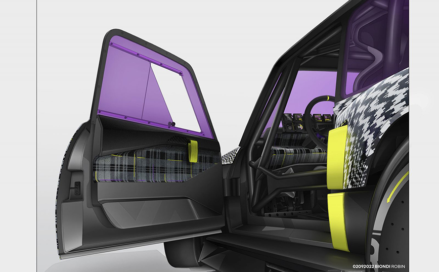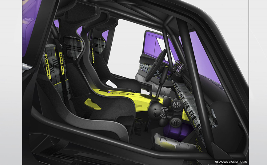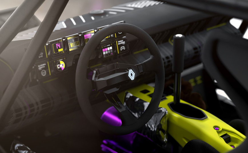 Στο εσωτερικό του R5 Turbo 3E, κυριαρχεί το πνεύμα της εποχής, με συνδυασμό στοιχείων από τους αγώνες αυτοκινήτου, τα video games και την εικόνα των εμβληματικών Renault 5 και 5 Turbo 2του παρελθόντος.