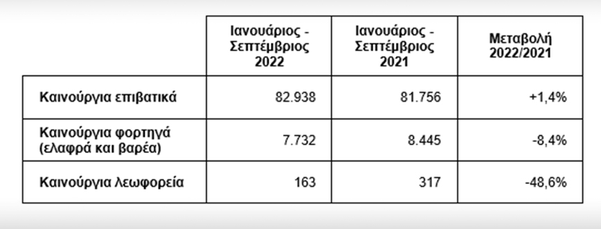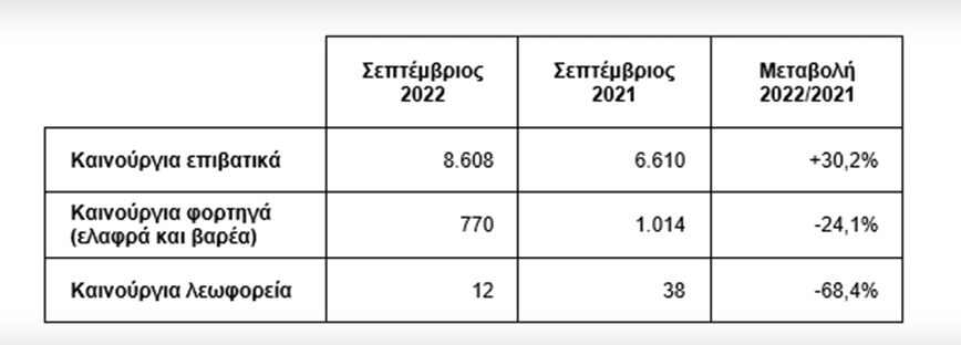 Παρά τα προβλήματα στις παραδόσεις καινούριων οχημάτων λόγω της έλλειψης ανταλλακτικών, η ελληνική αγορά συνέχισε και τον περασμένο Σεπτέμβριο να κινείται με εντυπωσιακές ανοδικές τάσεις που έφθασαν το 30% σε σχέση με τον ίδιο μήνα του 2021. Η εντυπωσιακή αυτή άνοδος εποηρέασε θετικά και το σύνολο πωλήσεων του 9μήνου που βρίσκεται στο +1,4% σε σχέση με την ίδια χρονική περίοδο του περασμένου έτους.